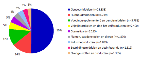 In 2018 werd het NVIC gebeld over bijna 14.800 blootstellingen (op een totaal van circa 47.600 blootstellingen; 31%) aan een breed scala van chemische producten. Het gaat om huishoudproducten, vrijetijdsartikelen en doe-het-zelf producten, cosmetica, industriele producten, bestrijdingsmiddelen en desinfectantia (zie figuur 1).