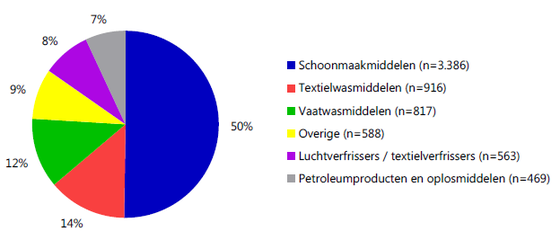 De huishoudproducten vormen de grootste categorie chemische producten waarover het NVIC geraadpleegd wordt. Binnen deze categorie worden blootstellingen aan schoonmaakmiddelen, zoals allesreiniger en chloorbleekmiddel, het meest gemeld.