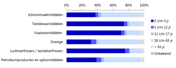 Kinderen jonger dan 5 jaar zijn het vaakst blootgesteld aan huishoudproducten, gemiddeld in 49% van de meldingen. Maar de grootste risico-producten voor deze jonge kinderen vormen de textielwasmiddelen, de vaatwasmiddelen en de lucht-/textielverfrissers (70-80% van de meldingen)!