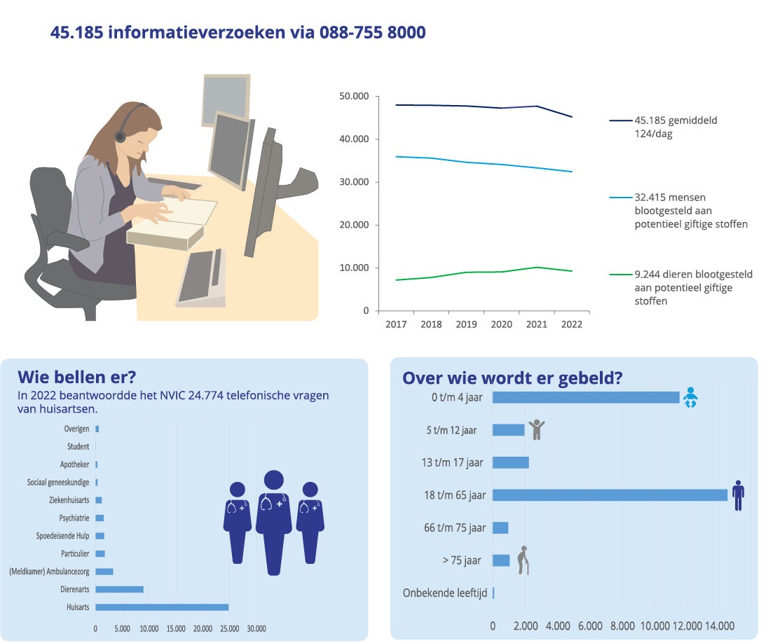 Het Nationaal Vergiftigingen Informatie Centrum (NVIC) is het kenniscentrum voor klinische toxicologie in Nederland. Het NVIC informeert artsen en andere professionele hulpverleners over de gezondheidseffecten en de behandeling van acute vergiftigingen. Naast een overzicht van de informatieverstrekking, toont dit jaarbeeld toont enkele opvallende ontwikkelingen uit het NVIC Jaaroverzicht 2022.