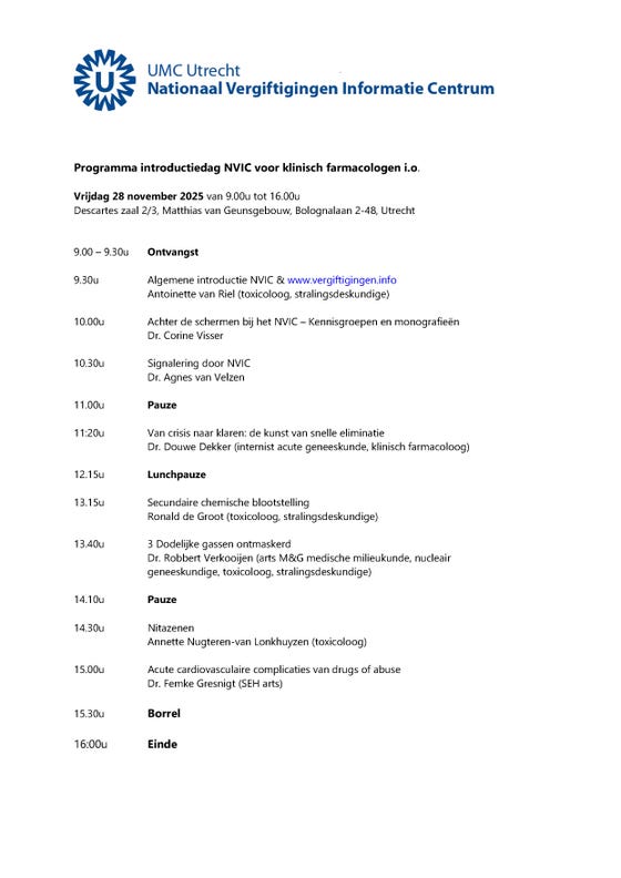Omdat toxicologie een prachtig vakgebied is, praten we daar graag over! Tijdens de NVIC-introductiedag krijg je een virtueel kijkje achter de schermen van het NVIC, onder andere: hoe komen onze stofmonografieën tot stand; van crisis naar klaren: de kunst van snelle eliminatie; secundaire chemische blootstelling (“moeten we die tent opzetten?”); acute cardiovasculaire complicaties van drugs of abuse, en de opkomst en gevaren van nieuwe synthetische opioïden (nitazenen).